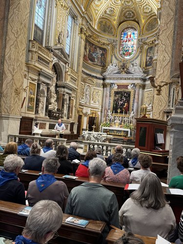 Am Nachmittag konnten die Pilgerinnen und Pilger unterschiedliche Programme wählen: Darunter Führungen durch Rom für Einsteiger mit Dekan Dominik Geiger, eine historische Erkundungstour durch Rom mit Generalvikar Markus Magin oder auch eine Tour durch das Stadtviertel „Centro Storico“ mit Kanzleidirektor Wolfgang Jochim. Mit Regens Franz Vogelgesang ging es auf einem Spaziergang „Abseits der Pfade“ und Diakon Michael Ganster bot an, die Trastevere zu entdecken. Erhard Steiger besuchte mit einer Gruppe das Benediktinerkloster St. Anselmo, Dekan Johannes Pioth bot eine Tour unter dem Titel „Römisches Jerusalem“ an und mit Pfarrer Udo Stenz ging es hoch hinaus: Gemeinsam mit ihm konnten die Pilgerinnen und Pilger Blicke über Rom erhaschen. Ein spirituelles Angebot boten Monika Kreiner und Dr. Margit Maar-Stumm und Peter Hundertmark an, wobei die Pilgernden geistliche Impulse mit den dreien aufschlüsselten und dann gemeinsam in Dialog traten und über die Texte ins Gespräch kamen. Für alle Singbegeisterte gab es auch einen eigenen Programmpunkt: Martin Erhard, Diözesankirchenmusikdirektor lud alle Interessierten ein in San Lorenzo, einer der ältesten Kirchen Roms einmal quer durch das Wallfahrtsliederheft zu singen.