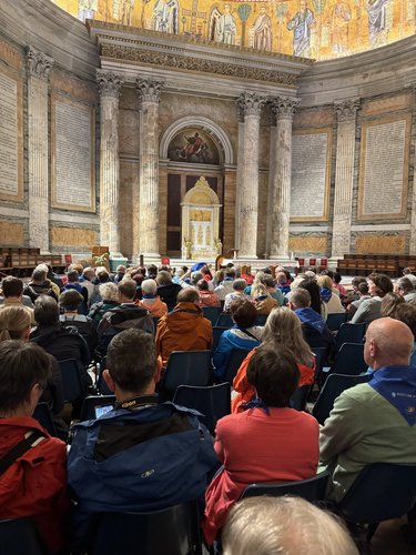 Gemeinsam unterwegs sein für die nächsten fünf Tage. Gemeinsam Glauben erleben und sich Gott näher fühlen. 357 Pilgerinnen und Pilger des Bistums Speyer haben sich auf den Weg gemacht. Und das ganz individuell – die einen zu Fuß, die anderen mit dem Bus, wieder andere mit dem Flieger. An diesem sonnigen Sonntagmorgen sind wir nun vor dem Lateran alle zusammengekommen und starten in die Wallfahrt im Heiligen Jahr 2025. Begleiten werden uns dabei immer wieder Hoffnungsklänge, das „Licht des Lebens“, die Hymne des Heiligen Jahres, mit dem wir uns mit allen Christinnen und Christen verbunden fühlen können. Eckpfeiler unserer Wallfahrt ist das Durchschreiten der Heiligen Pforten. Die erste, durch die wir in Stille laufen, ist die Porta Santa der Lateranbasilika. Anschließend findet sich Zeit, die beeindruckend verzierte Basilika zu erkunden.